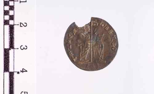 Sopra breve linea orizzontale, S. Marco, in piedi a s., volto a d., porge con la d. il vessillo, con banderuola a d., al Doge genuflesso, che lo prende con ambo le mani.