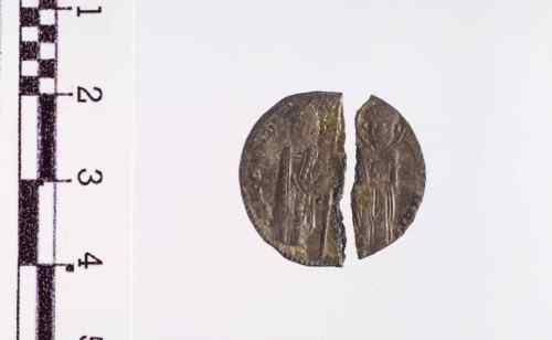 S. Marco in piedi a d. porge il vessillo al Doge a s. in piedi.