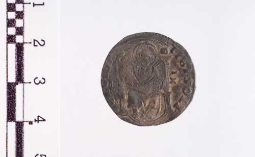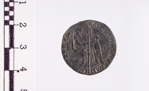 San Marco stante a s. porge porge il vessillo al Doge genuflesso che lo prende con ambo le mani, lungo l'asta del vessillo D/V/X, ai lati ZF e T