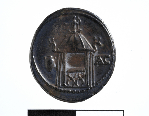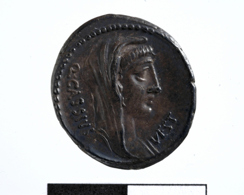 Testa di Vesta a d. con velo. Cerchio di puntini.