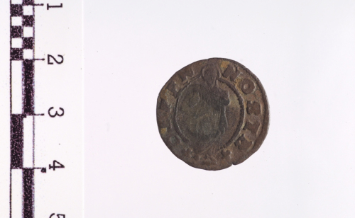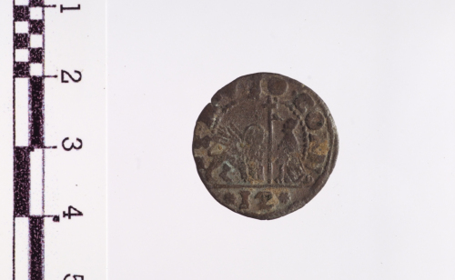 Leone marciano rampante verso d. con zampa su libro aperto, a d. il doge inginocchiato a s. tiene con ambo le mani il vessillo