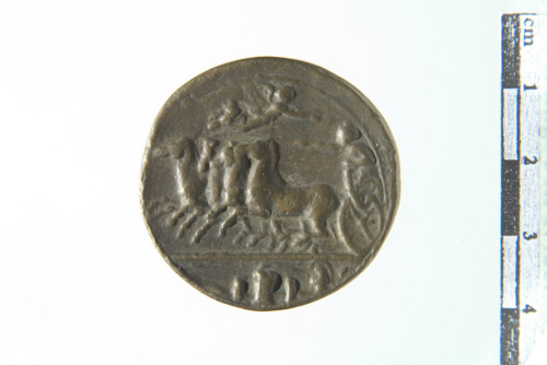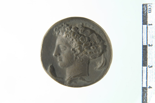 Testa di Aretusa a s.; attorno tre(?) delfini