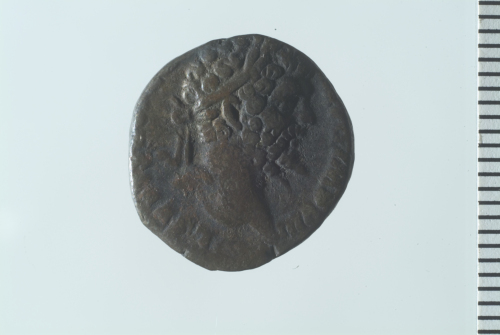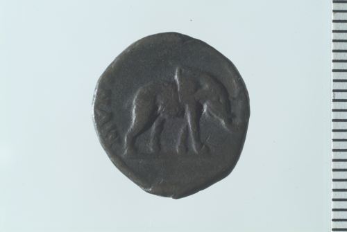 Testa laureata di Settimio Severo a d.; contorno perlinato.