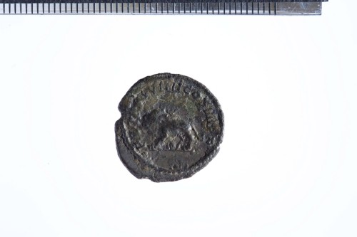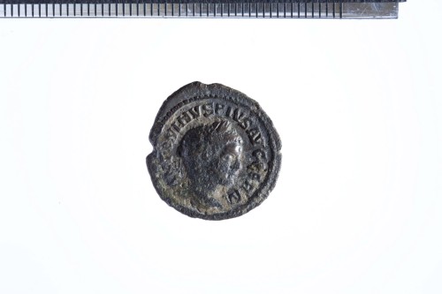 Testa laureata di Caracalla a d.; contorno perlinato.