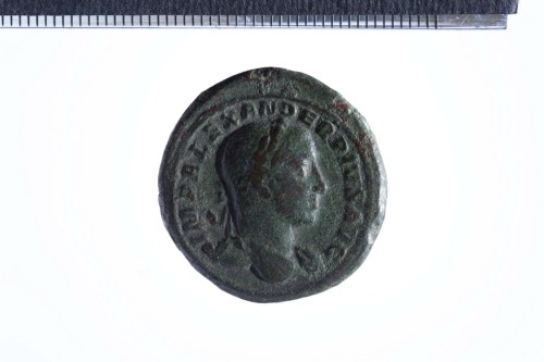 Busto laureato di Alessandro Severo a d., con paludamentum; contorno perlinato.
