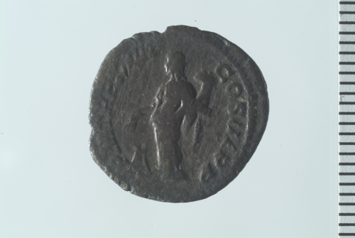 Testa laureata di Settimio Severo a d.; contorno perlinato.