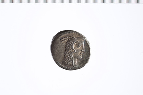 Testa di Giunone Sospita a d. con copricapo in pelle caprina. Bordo perlinato.