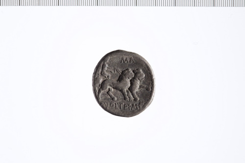 Busto elmato e drappeggiato a d.; dietro contrassegno illeggibile. Cerchio perlinato.