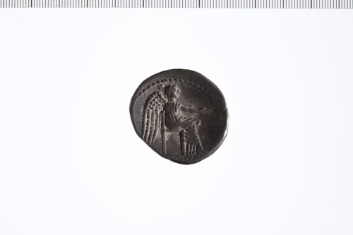 Busto drappeggiato femminile a d. con i capelli legati da un nastro. Bordo perlinato.