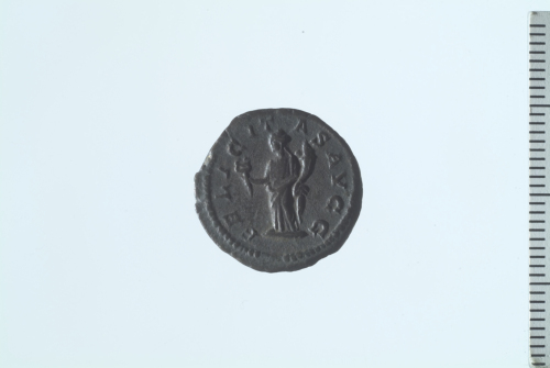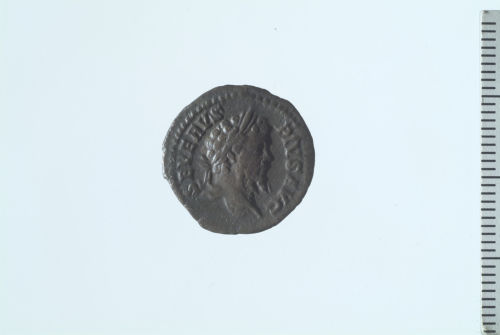 Testa laureata di Settimio Severo a d.; contorno perlinato.