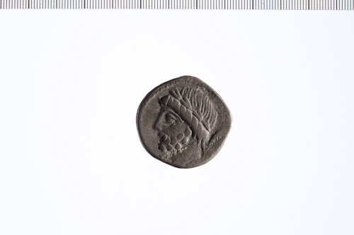 Testa laureata di Saturno a s., dietro arpa. Contorno perlinato.
