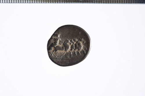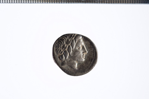 Testa con corona di quercia di Apollo a d.; sotto, un fulmine; c.p.