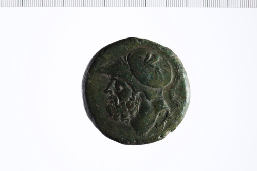 Testa di Ares elmata a s.; elmo decorato con pegaso.