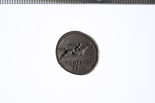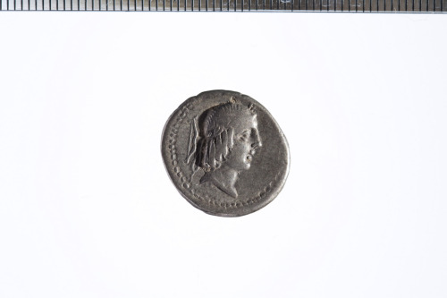 Testa laureata di Apollo a d. con i capelli fermati da un nastro. Bordo perlinato.