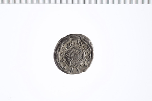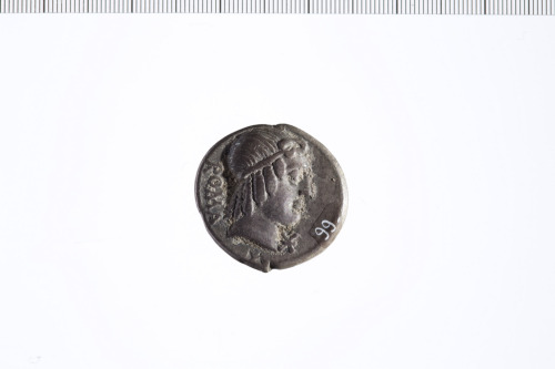 Testa elmata di Apollo a d. con i capelli raccolti con una fascia. Contorno perlinato.
