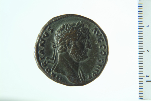 Busto laureato di Adriano a d., drappeggiato sulla spalla s.; contorno perlinato.