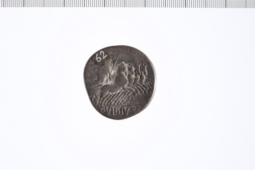 Minerva in quadriga a d. con lancia e redini nella mano s. e trofeo nella d. Contorno perlinato.