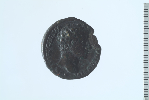 Testa nuda di Marco Aurelio a d.; contorno perlinato.