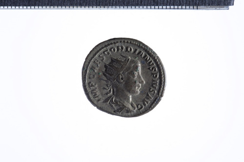 Busto radiato di Gordiano III a d. con corazza e paludamentum, di tre quarti di spalle; contorno perlinato.