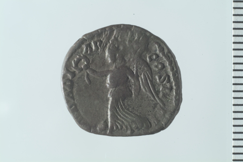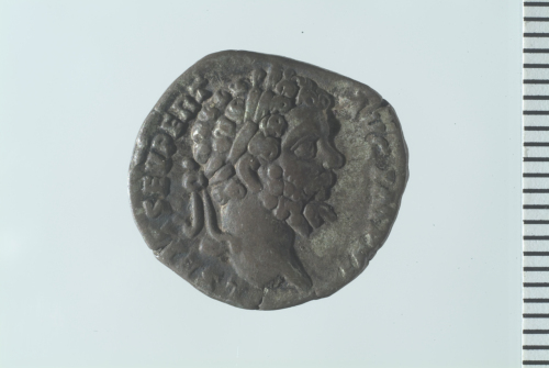Testa laureata di Settimio Severo a d.; contorno perlinato.