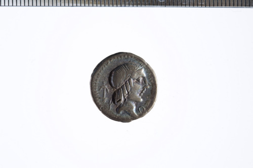 Testa laureata di Apollo a d. con i capelli fermati da un nastro. Bordo perlinato.
