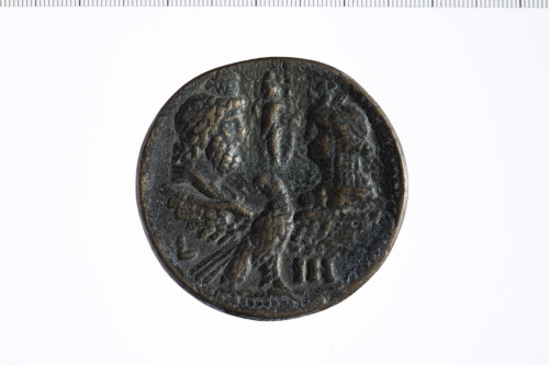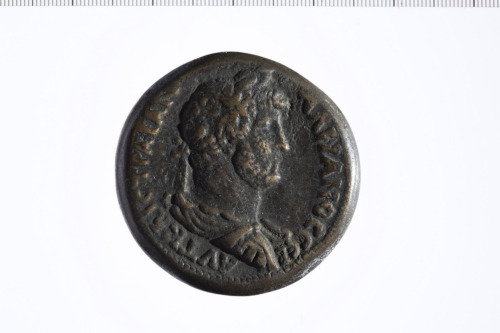 Busto laureato di Adriano a d., paludato, corazzato, di tre quarti, di spalle.