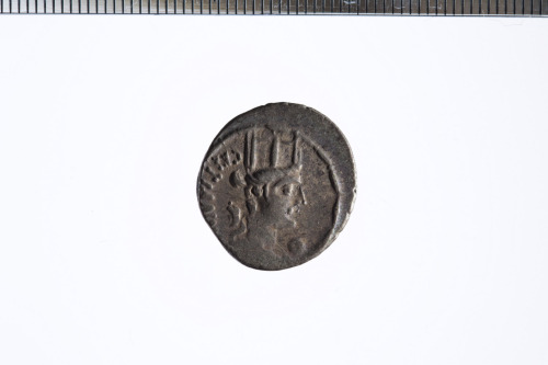 Tests di Cibele a d., con corona turrita. Dietro le spalle, protome di leone. A d. in basso, globo.