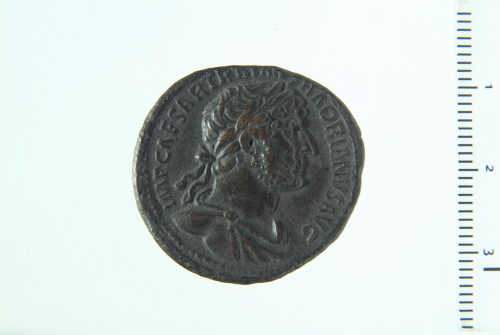 Busto laureato di Adriano a d., con paludamentum, di tre quarti in avanti; contorno perlinato.