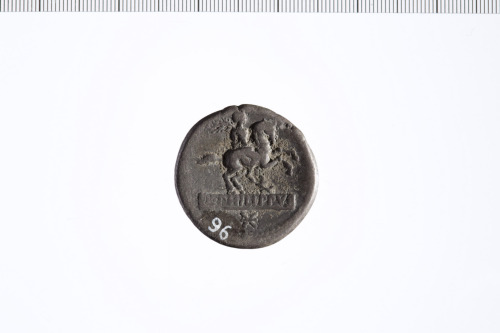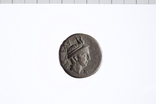 Testa maschile a d. con elmo con corna da capra e diadema. Contorno perlinato.