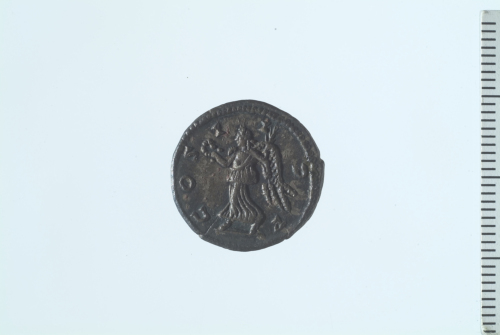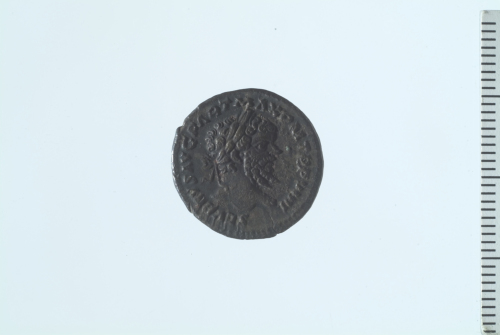Testa laureata di Settimio Severo a d.; contorno perlinato.