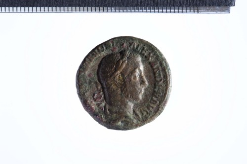 Busto laureato di Alessandro Severo a d., con paludamentum; contorno perlinato.