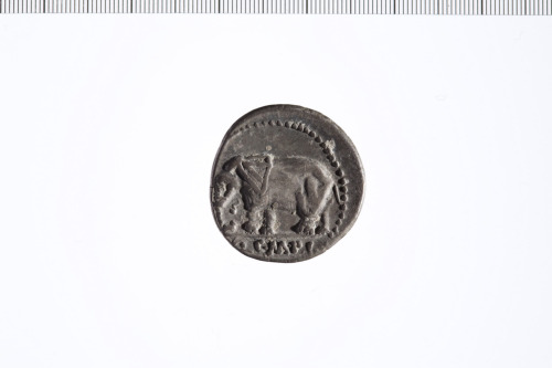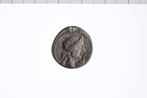 Testa di Pietas diademata a d.; davanti cicogna. Cerchio perlinato.