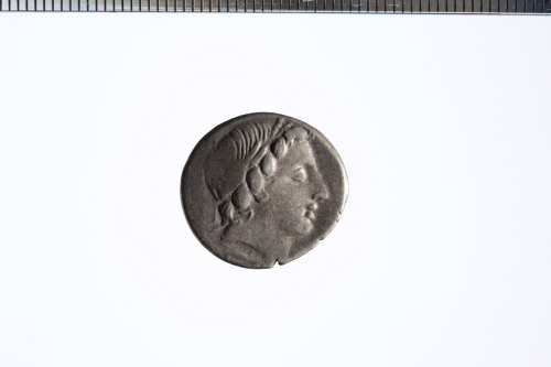 Testa con corona di quercia di Apollo a d.; sotto, un fulmine; c.p.