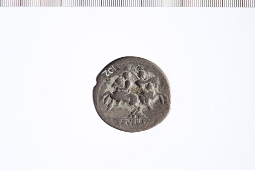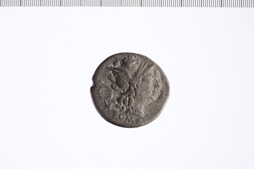 Testa elmata di Roma a d. con collana di pendenti, dietro lituus. Contorno perlinato.