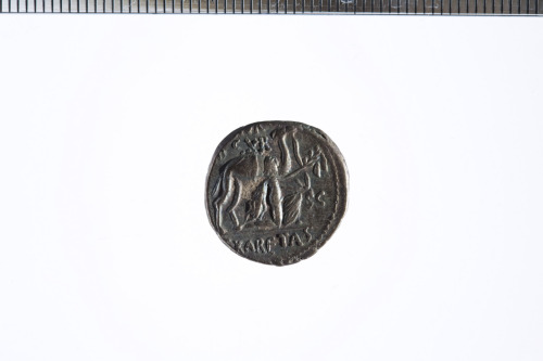 Cammello sellato a d. Davanti figura inginocchiata, con mantello e lunga tunica, che tiene nella mano s. le redini e con la d. un ramoscello d'ulivo ornato con nastro. Bordo perlinato.