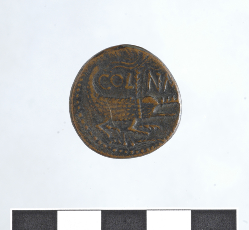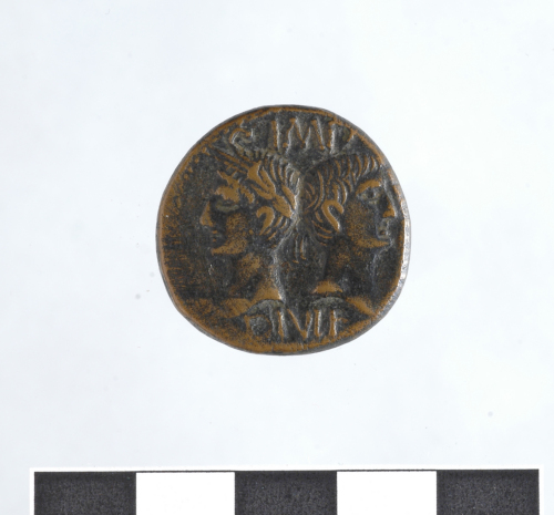 Teste di Agrippa che indossa una corona rostrale a sin. e di Augusto barbuto a d.;IMP DIVI F
