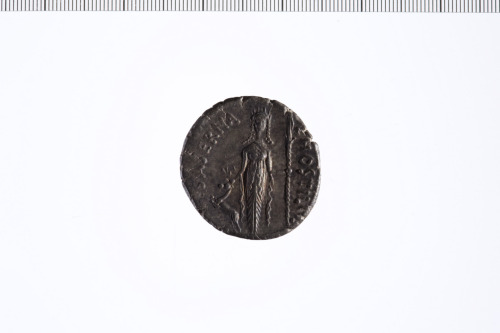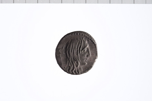 Testa femminile dai lunghi capelli a d.; a s. un carnyx. Bordo perlinato.