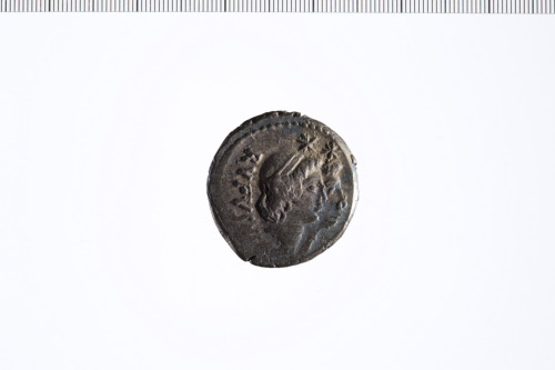 Teste dei Dioscuri a d. con i pilei sormontati da due stelle e decorati con due nastri. Bordo perlinato.