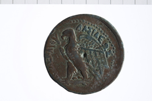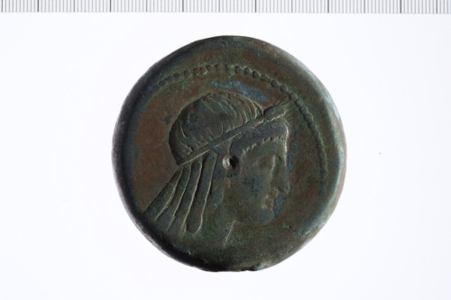 Testa femminile a d. con riccioli lunghi e corona d'alloro. Contorno lineare.