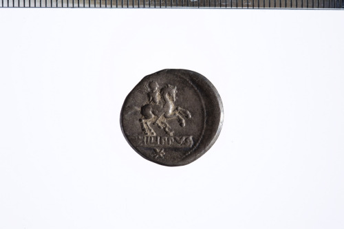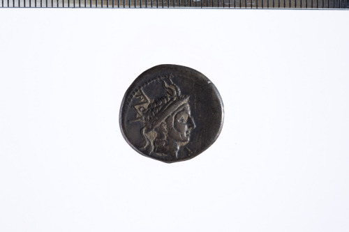Testa di Filippo V di Macedonia con elmo e diadema a d., dietro (ROMA), davanti sotto il mento lettera greca (phi)