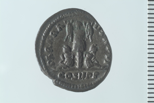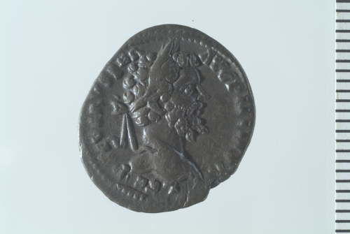 Testa laureata di Settimio Severo a d.; contorno perlinato.