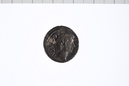 Testa barbata di Ottaviano a d. Bordo perlinato.