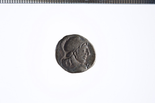 Busto di Marte con elmo corinzio visto da dietro con la testa volta a d., con una lancia sulla spalla s. e una spada sulla d.; c.p.
