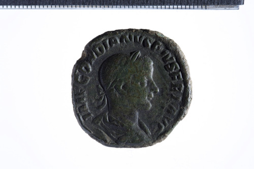 Busto laureato di Gordiano III a d. con corazza (?) e paludamentum, di tre quarti di spalle; contorno perlinato.