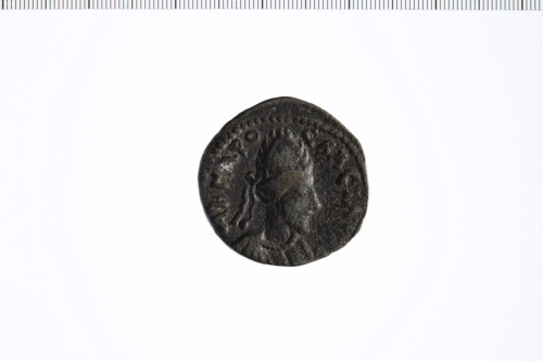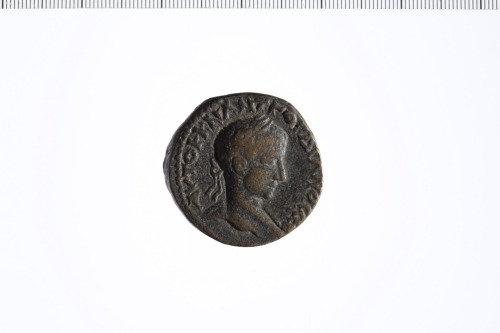 Busto laureato a d. di Gordiano Pio, paludato, di tre quarti, di spalle; contorno perlinato.