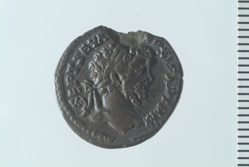 Testa laureata di Settimio Severo a d.; contorno perlinato.