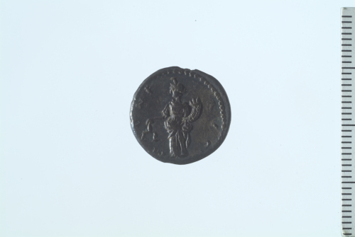 Testa laureata di Settimio Severo a d.; contorno perlinato.
