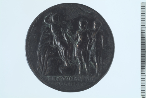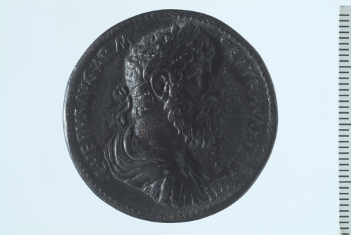 Busto laureato, corazzato e paludato di Lucio Vero a d.; contorno perlinato.