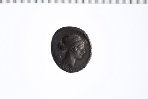 Testa laureata di Apollo a d. Bordo perlinato.