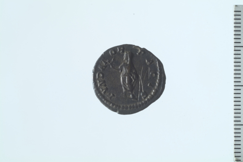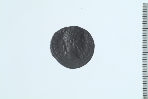 Testa laureata di Settimio Severo a d.; contorno perlinato.